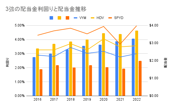 配当狙いのETFであれば、「VYM」「HDV」「SPYD」が3強。