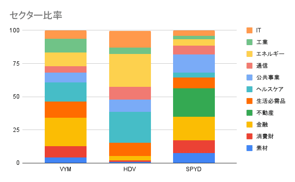 VYMとHDVは、投資対象セクターは同じで、比率が異なります。